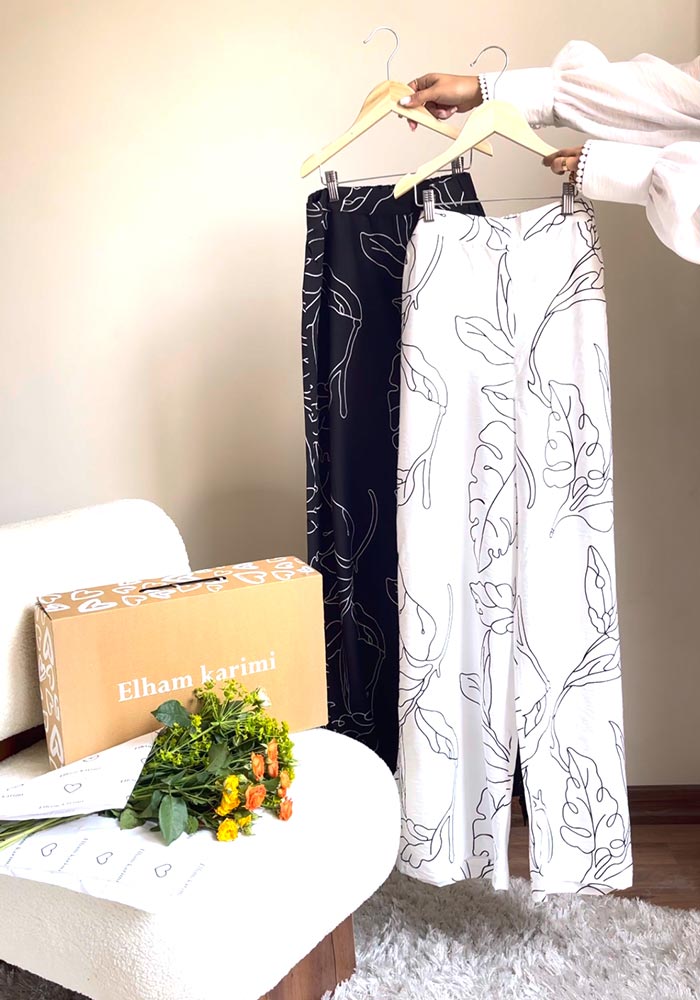 پشت کمر کش, شلوار برگ سفید مشکی, قسمت جلو کمر زیپ |